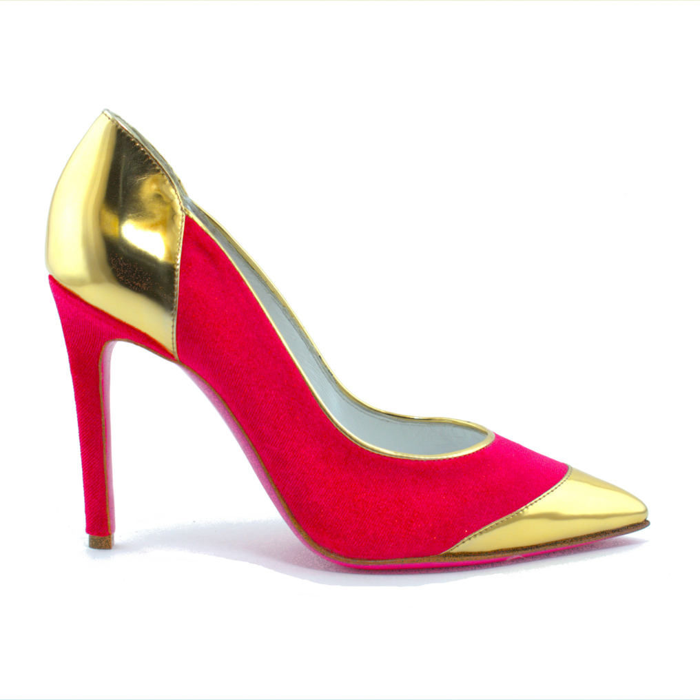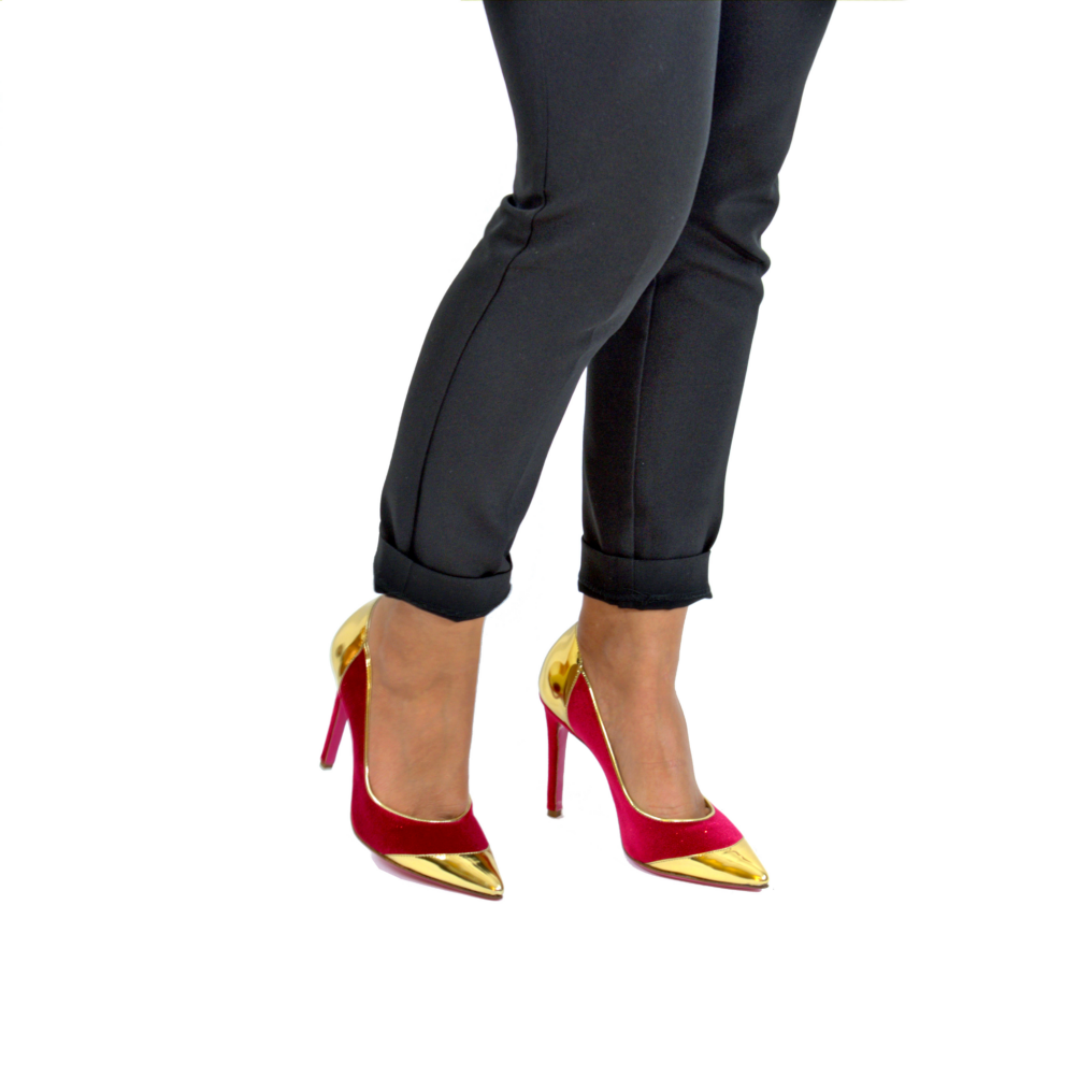 Classica ma con carattere, Sandra esprime tutta la raffinatezza artigianale della maison. Il velluto rosso riflesso cattura la luce con eleganza, mentre punta e tallone in pelle oro specchiato aggiungono un accento glamour. Il tacco a spillo da 105 mm slancia con decisione, perfetto per occasioni serali o cerimonie.